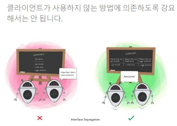 그래서 그걸 구현한 클래스들이 역할을 수행하는 데 있어서 필요한 작업만 수행해야 한다. 즉, 필요한 코드만 구현하여 갖고 있어야 한다.