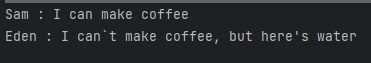 System.out.println("Eden : I can`t make coffee, but here's water ");