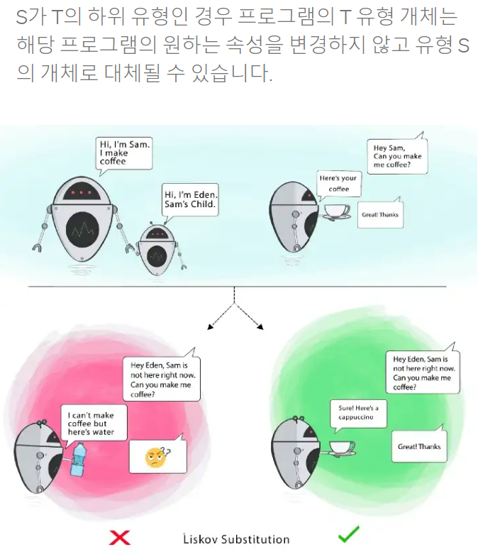 - Liskov Substitution Principle (LSP): 상위 타입의 객체가 있다면 하위 타입의 객체로 대체 가능해야 한다.