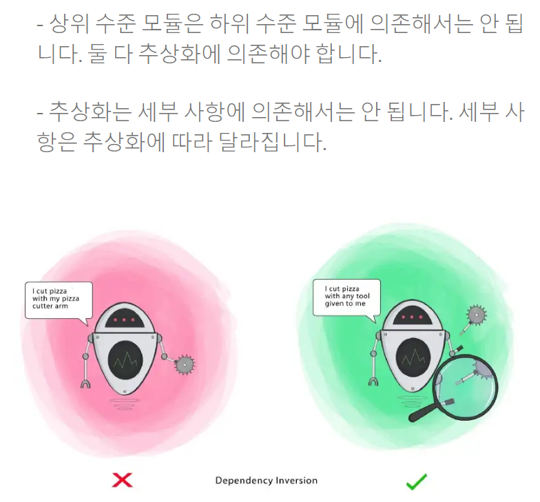 - Dependency Inversion Principle (DIP): 상위 수준의 구성요소는 저수준의 구성요소에 의존해서는 안 된다.