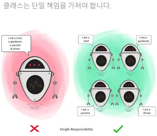 - Single Responsibility Principle (SRP): 각 클래스는 단 한 가지 책임을 가져야 한다.
